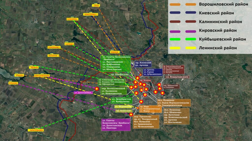 Карта включает в себя точки, из которых наиболее часто ведутся обстрелы жилых кварталов городов Республики с применением РСЗО и артиллерии калибром 155 и 152 мм.
